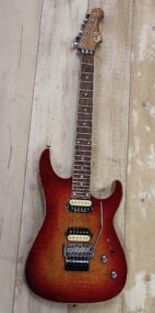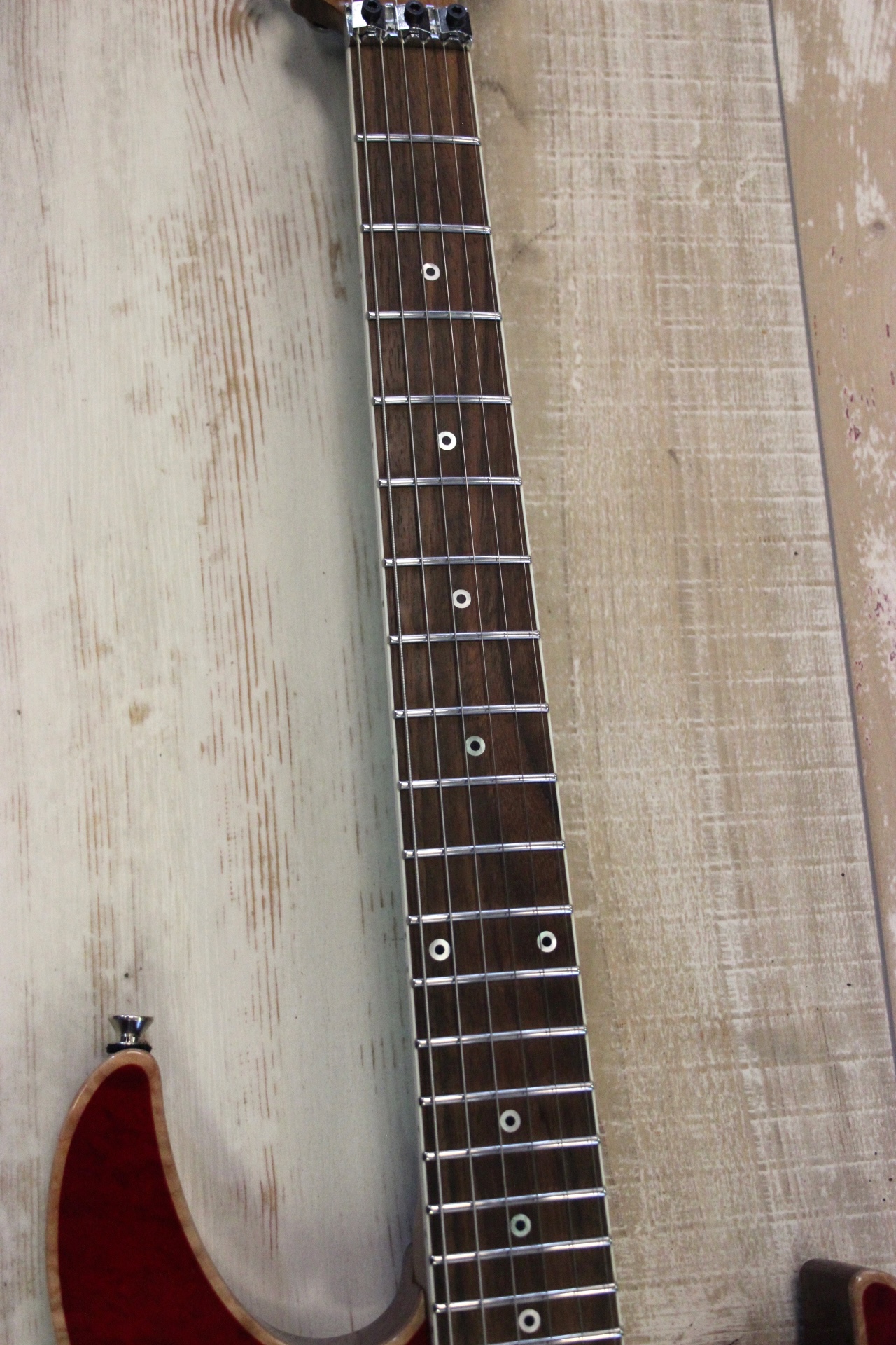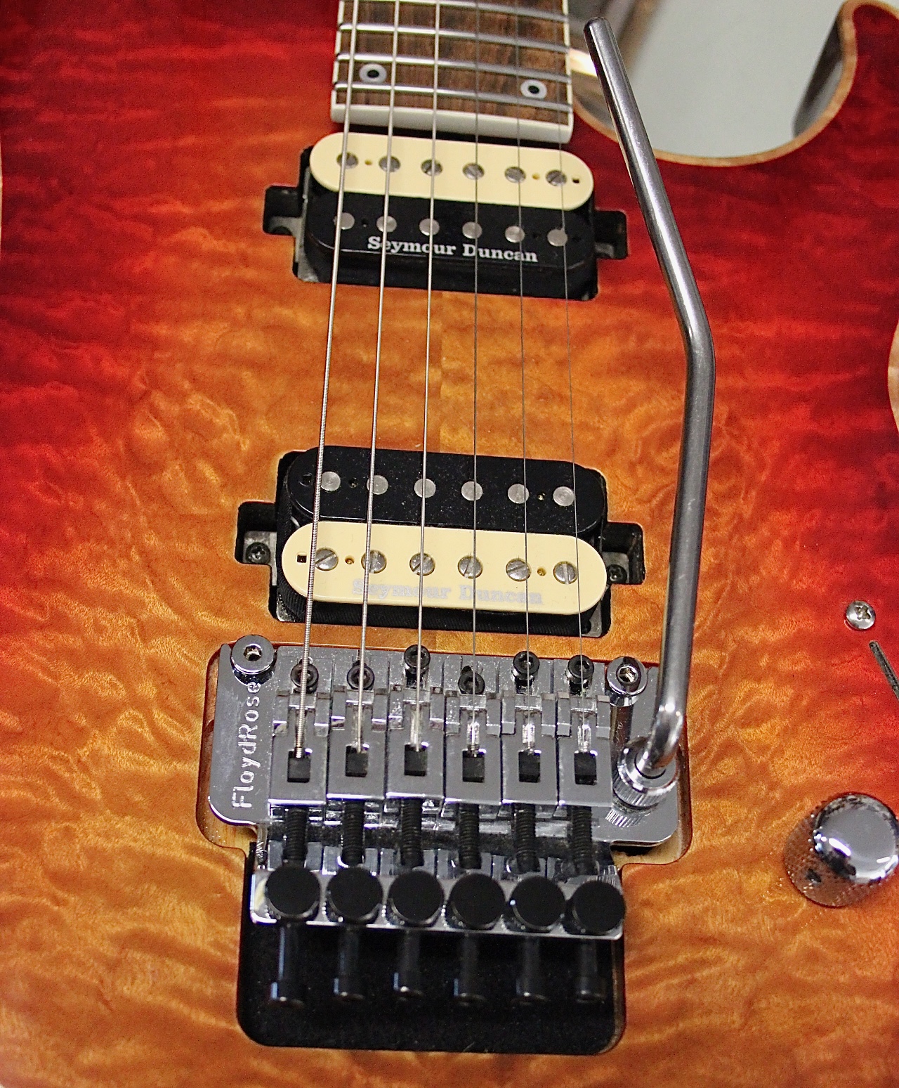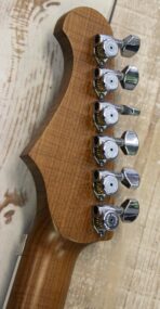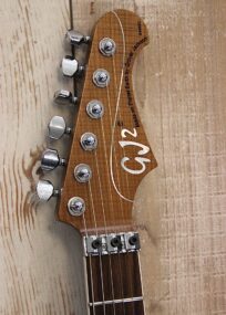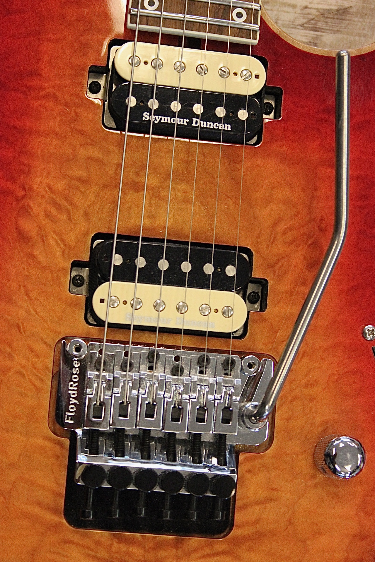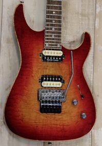 In Germany so sonst nicht zu bekommen, extrem hochwertige GJ2 des amerikanischen Gitarrenbau-Guru’s Grover Jackson. Tonabnehmer: Seymour Duncan Pearly Gates – beide splitbar!Nobel-Superstrat aus der Werkstatt von Grover Jackson. Die amerikanische Ikone war früher der Kopf hinter Charvel und Jackson Guitars. Mittlerweile ist er unter anderem äußerst erfolgreich mit Friedman Gitarren und seinem eigenen Kleinserien-Label GJ2.Hier ein weiteres Beispiel für Grover Jacksons Gitarrenbau-Kunst auf höchstem Niveau – kein Vergleich zu heutigen Jackson Gitarren ( die sind ja inzwischen von Fender gekauft )Made in Orange County, USA – auch, wenn auf der Kopfplatte der „Planet Erde“ als universelle Herkunft ausgewiesen ist. Dies hat die kleine Boutique-Manufraktur im vorauseilenden Gehorsam hinsichtlich strenger US-Normen veranlasst, da schließlich nicht alle Teile aus den USA kommen (können). Amerikanisches Mahagoni ist nunmal schwer zu finden…Schlanker, gerösteter Ahorn Hals („Roasted Maple“) – wunderschön geriegelt und mit stehenden Jahresringen für noch mehr Stabilität und Sustain , mit eingefasstem Palisander-Griffbrett (10′-14′ Compound Radius), Abalone Bullseye-Inlays und 24 Jescar 57110 Edelstahl-Bünden.Erle-Body mit wunderschönem „Quilted Maple Top“ und „Fake Binding“.Hardware: Original Floyd Rose Tremolo und Hipshot Locking Tuners.