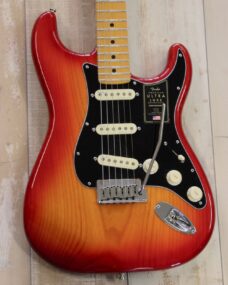 FENDER ULTRA LUXE STRATOCASTER MADE in USA :Für Spieler, die sich bestmögliche Performance und ultimativ guten Tone wünschen: Die American Ultra Serie präsentiert Fenders fortschrittlichsten Gitarren und Bässe. Die American Ultra Luxe Stratocaster mit Edelstahl-Bünden in auffälligen Custom-Farben mit passend lackierter Kopfplatte darf sich zu Recht „Ultra” nennen – sie ist ultra hochentwickelt : Den Hals der American Ultra Luxe Stratocaster hat Fender im exklusiven Augmented D-Profil gearbeitet und die Griffbrettkanten ultra sanft abgerundet. So bietet er einen sensationellen Spielkomfort. Ein schmal zulaufender Halsfuß erleichtert das Greifen bis in die höchsten Lagen. Das Griffbrett im 10”-14” Compound-Radius mit 22 Medium Jumbo Frets aus EDELSTAHL !!! ist wie geschaffen für akkurates, geschmeidiges Solospiel. Die Ultra Noiseless™ Vintage Pickups mit optimierten Schaltmöglichkeiten liefern praktisch endlos viele Klangvarianten – ohne störendes Brummen. Die ergonomisch modellierte Korpus-Rückseite ist ebenso schön wie funktional, sie fühlt sich in jeder Spielposition bequem an. Weitere Details: geschlossene Locking Tuner, Chrom-Hardware und ein TUSQ™ Sattel, Eschenbody …. Neupreis ca. 2600.- aufwärts …. hier gebraucht und praktisch in Neuzustand ( nur leichte Spuren auf dem Pickguard ) für 1699.- inklusive Suhr Luxus Gigbag ( fast ein Koffer