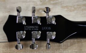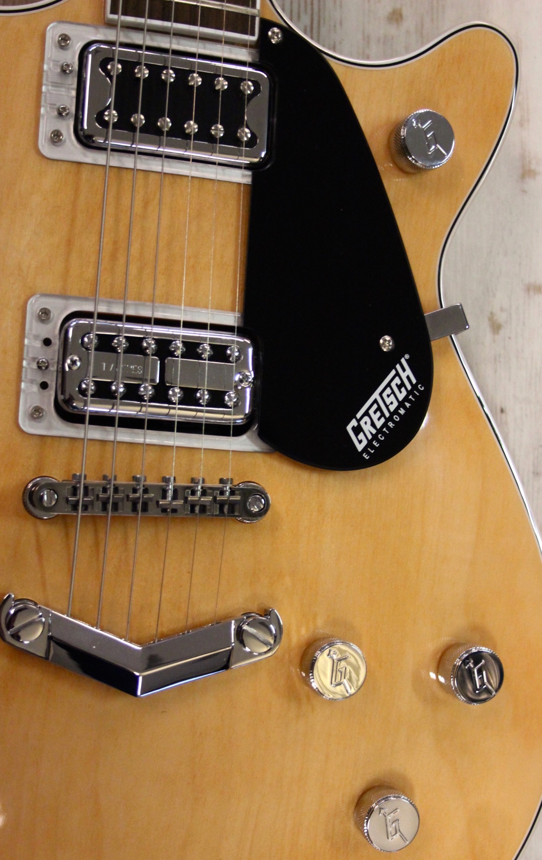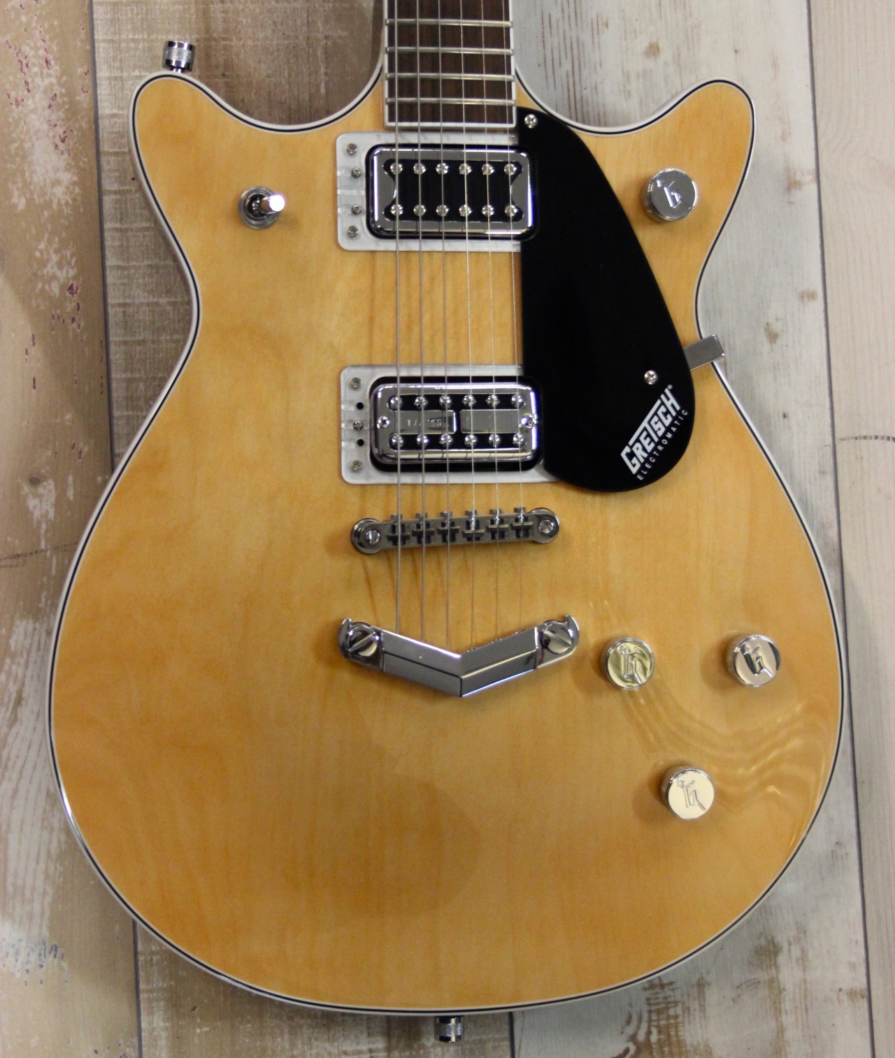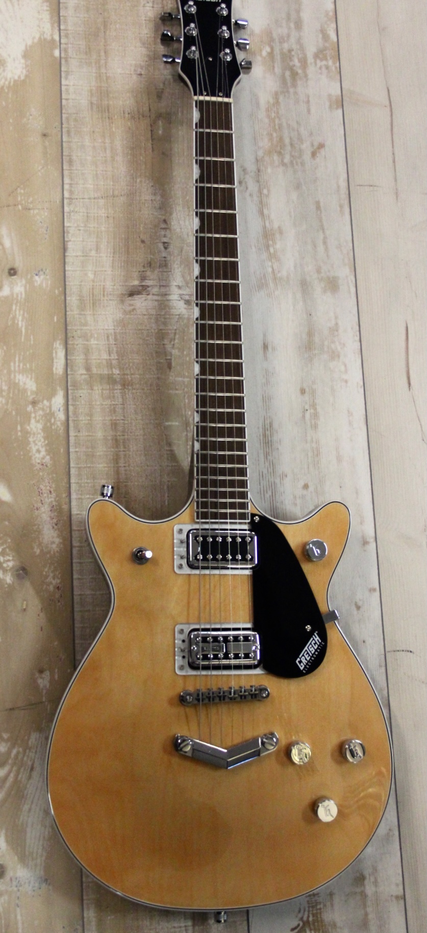 GRETSCH 5222 MALCOLM YOUNG : Electromatic Double Jet Serie , Korpus: Mahagoni , Decke: Ahorn , geleimter Hals: Mahagoni mit Lorbeer Griffbrett , Pearloid Neo-Classic Thumbnail Griffbretteinlagen , Halsprofil: Thin U , Griffbrettradius: 305 mm (12,01″) , Mensur: 625 mm (24,61″) , Sattelbreite: 43 mm (1,69″) , Black Top Broad Tron Humbucker am Hals und nachgerüstet ein TV JOPNES Pickup ( 160.- plus Einbau ) an der Bridge für professionellen Gretsch Sound – der gleiche den auch M. Young spielte , Locking Mechaniken für schnellen Saitenwechsel und mehr Stimmstabilität … tolle optik in aged Natural …. hier in fast Neuzustand für nur 429.-