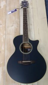 IBANEZ AE 200 JR – DBF ELECTRO-ACOUSTIC : wunderbar handliche Mini Jumbo mit extrem leichter Bespielbarkeit – unter anderem auch wegen der kurzen 60,7 cm Mensur , man muss sich nicht so weit strecken und die Saitenlage ist so tief dass man nicht kämpfen muss , massive Fichtendecke , Okoume Boden und Zargen , Nyatoh Hals – am Sattel 44 mm breit , Ovankol Griffbrett , ausgeglichener Klang – nicht so laut wie eine Dreadnought aber dafür sehr differenziert , aktives Pickup System ohne weitere Regler – ist auch nicht nötig da es sofort perfekt klingt , und dann sieht sie in diesem matten Dunkelblau auch noch sehr schick aus ..….. hier als Restposten wegen Modellwechsels – natürlich A-WARE – statt wie überall im Netz für 470.- plus … für nur 369.- inclusive schmucker Tasche …. 25% = 100.- mindestens gespart