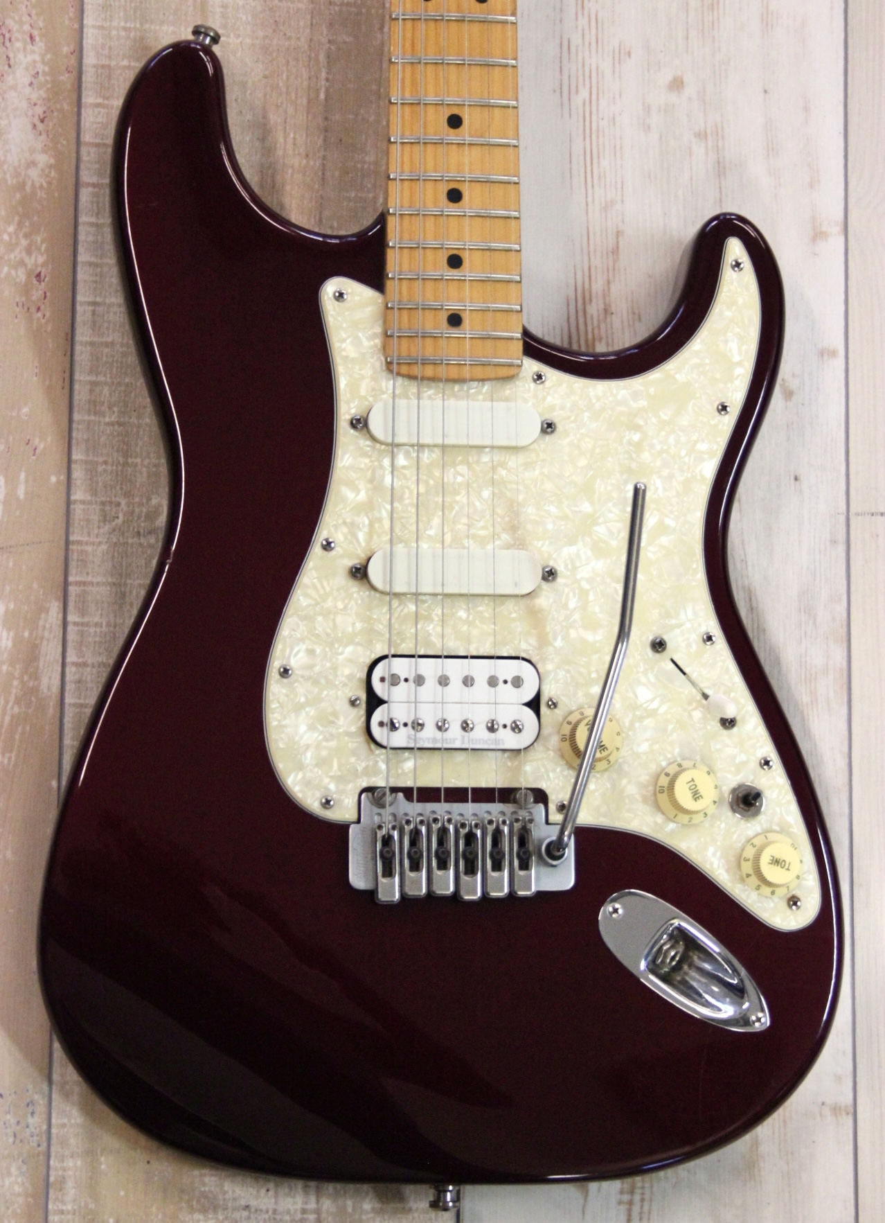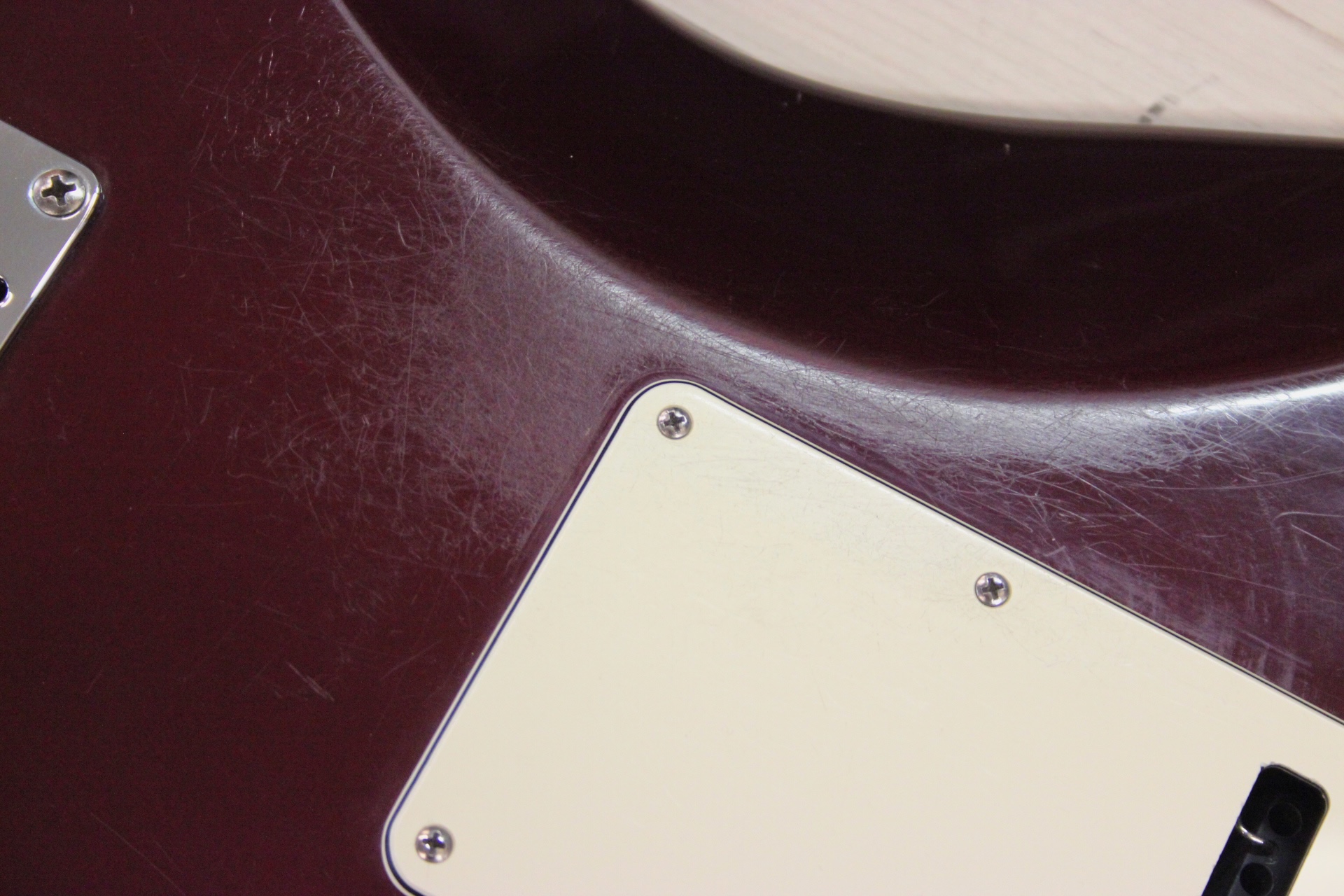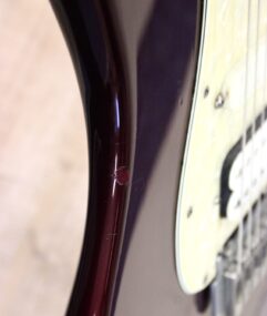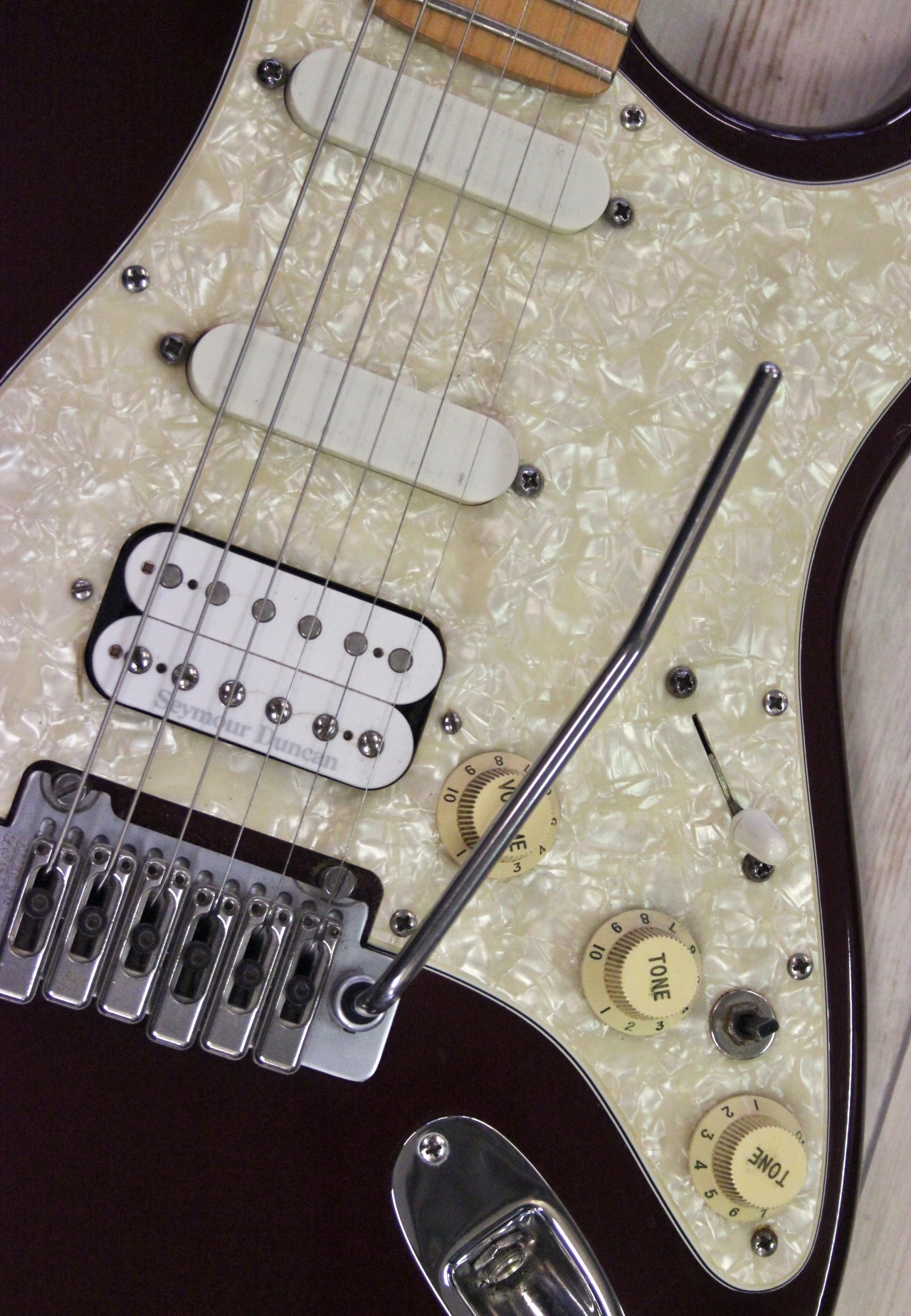 FENDER USA DLX STRATOCASTER Bj 1991 : Made in USA und Top verarbeitet , technisch super Zustand , optisch guter Gesamteindruck – allerdings auch mit einigen Spuren ( 45 Jahre alt – Gürtelspuren auf der Rückseite , reparierter Kitsch an der Seite – siehe die letzten 2 Bilder ) , Bünde sind gut , 1 Lace Sensor Gold am Hals – klingt Super – 1 Lace Sensor in der Mitte – 1 Seymour Duncan an der Pridge ( viel Druck – und Parallel / Singlecoil / Reihe schaltbar per Mini Switch ) , angenehm leichte Bespielbarkeit , hochwertige Locking Mechaniken , gut laufendes Wilkinson Tremolo , Farbe Dunkel Weinrot Metallic ….. viel Stratocaster für nur 1190.- inclusive soliden TKL Case